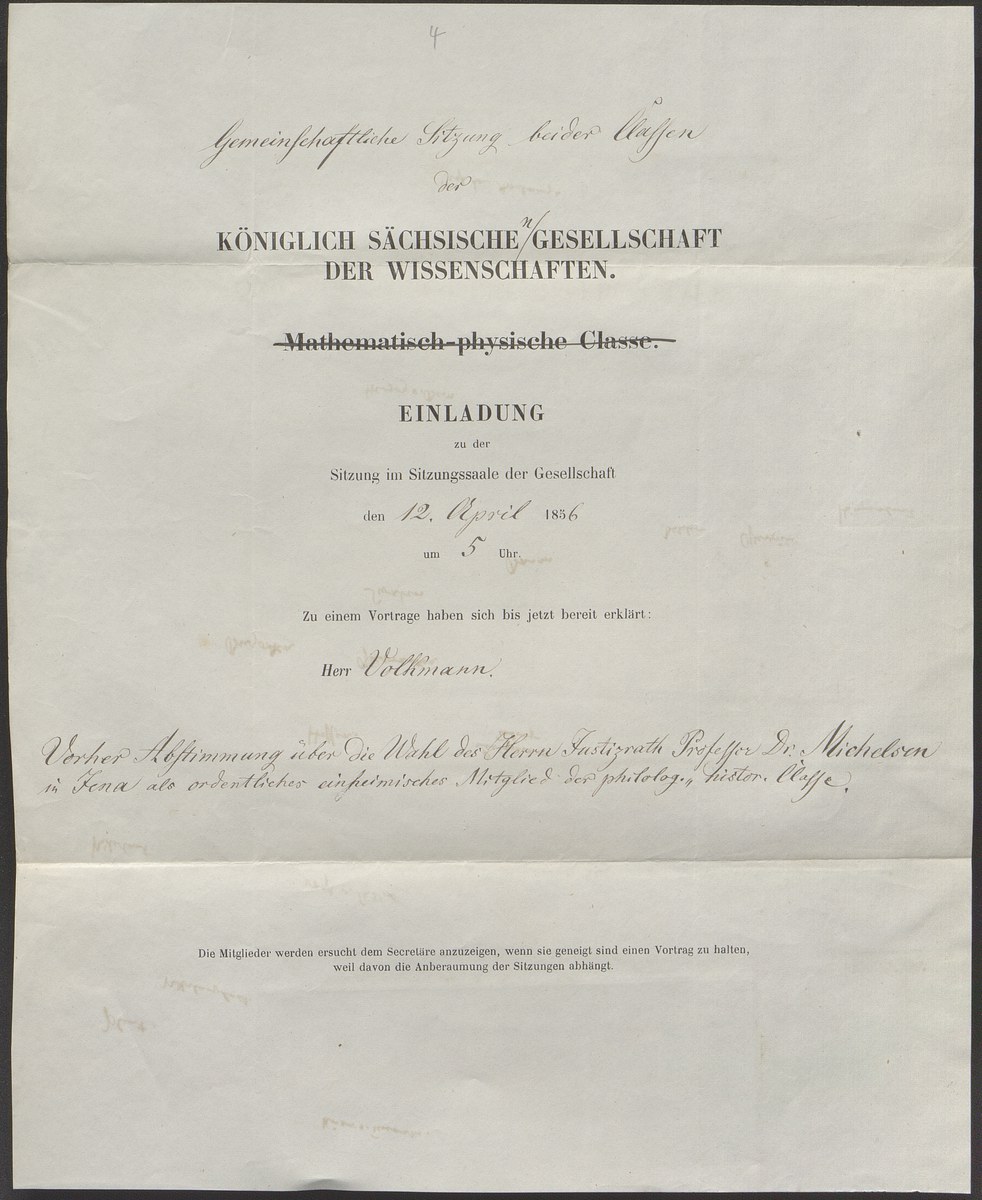 Einladung zu einer Sitzung beider Klassen der Königlich Sächsischen Gesellschaft der Wissenschaften (12.04.1856).