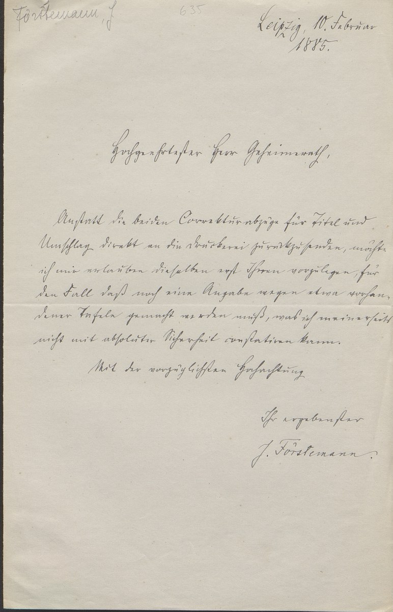 Universitätsbibliothek Leipzig, Nachlass Friedrich Zarncke, NL 249/1/F/635: Joseph Förstemann an Friedrich Zarncke (Leipzig, 1885-02-10)