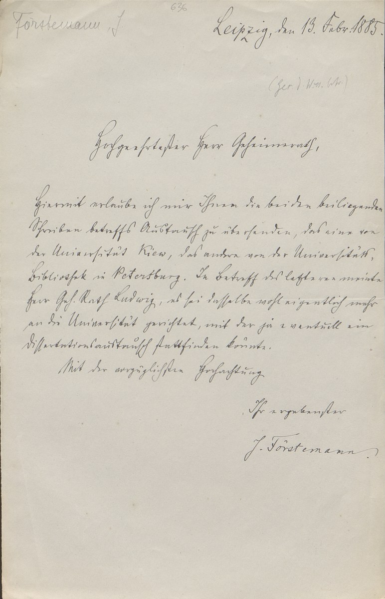 Universitätsbibliothek Leipzig, Nachlass Friedrich Zarncke, NL 249/1/F/636: Joseph Förstemann an Friedrich Zarncke (Leipzig, 1885-02-13)