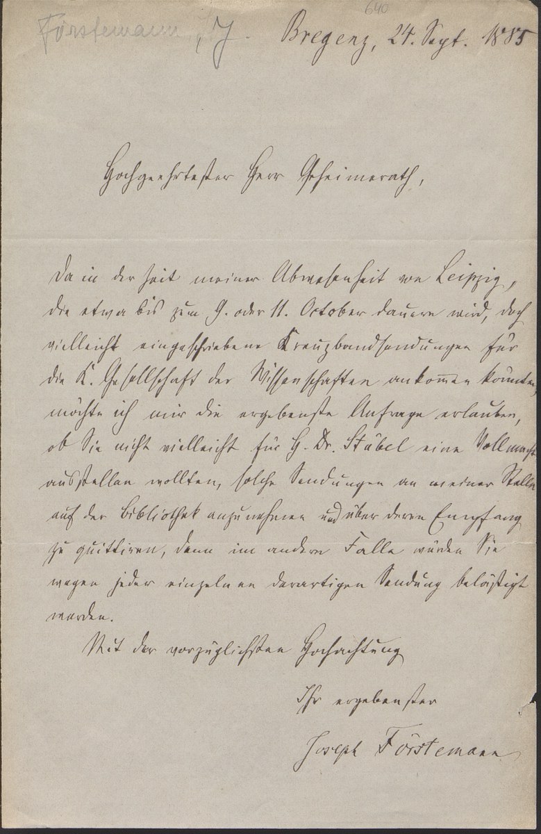 Universitätsbibliothek Leipzig, Nachlass Friedrich Zarncke, NL 249/1/F/640: Joseph Förstemann an Friedrich Zarncke (Bregenz, 1885-09-24)