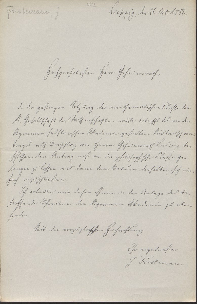 Universitätsbibliothek Leipzig, Nachlass Friedrich Zarncke, NL 249/1/F/642: Joseph Förstemann an Friedrich Zarncke (Leipzig, 1886-10-26)