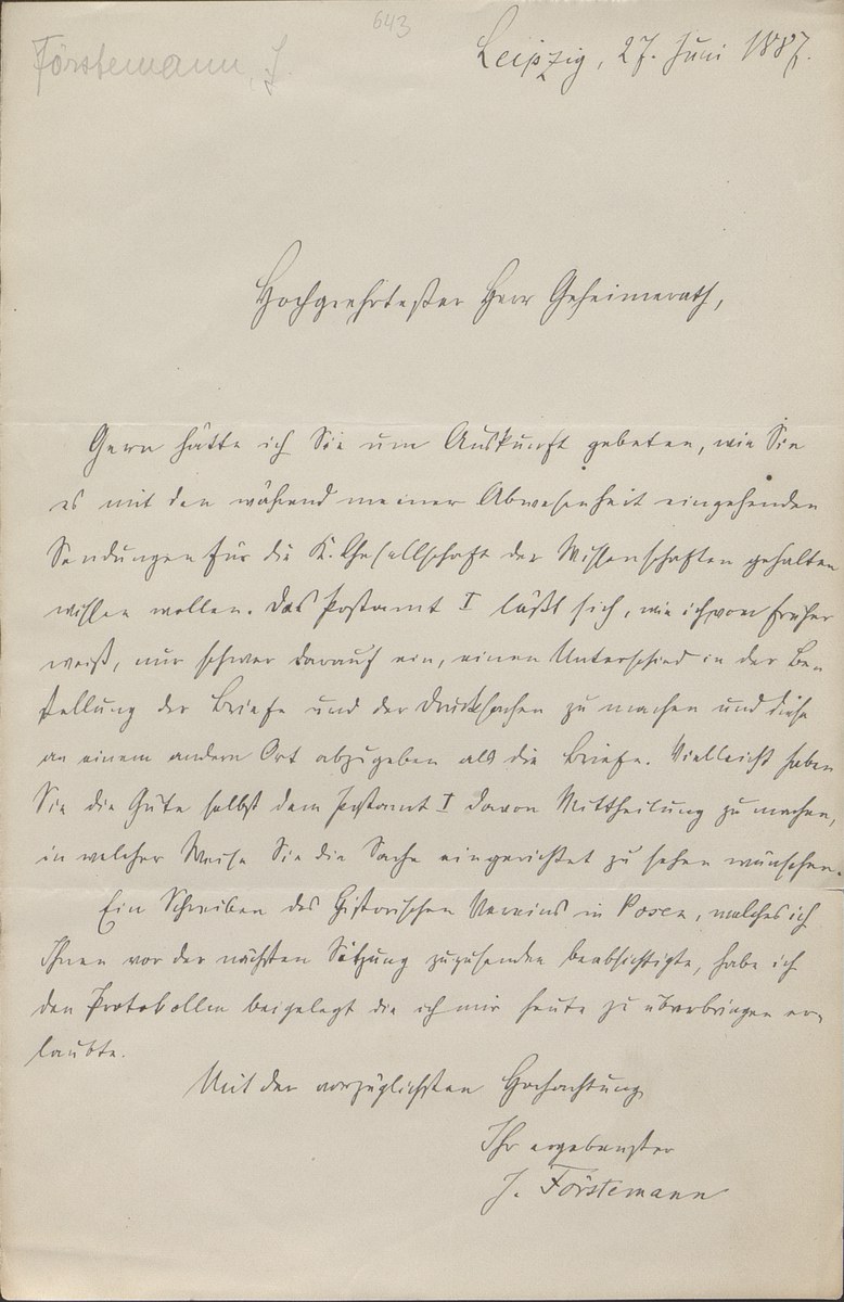 Universitätsbibliothek Leipzig, Nachlass Friedrich Zarncke, NL 249/1/F/643: Joseph Förstemann an Friedrich Zarncke (Leipzig, 1887-06-27)