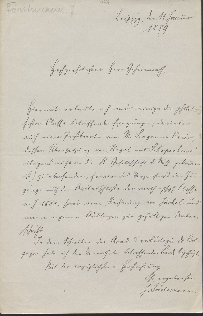 Universitätsbibliothek Leipzig, Nachlass Friedrich Zarncke, NL 249/1/F/646: Joseph Förstemann an Friedrich Zarncke (Leipzig, 1889-01-11)
