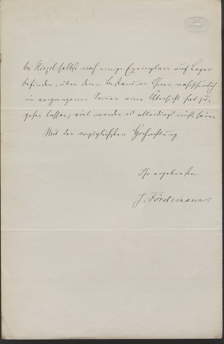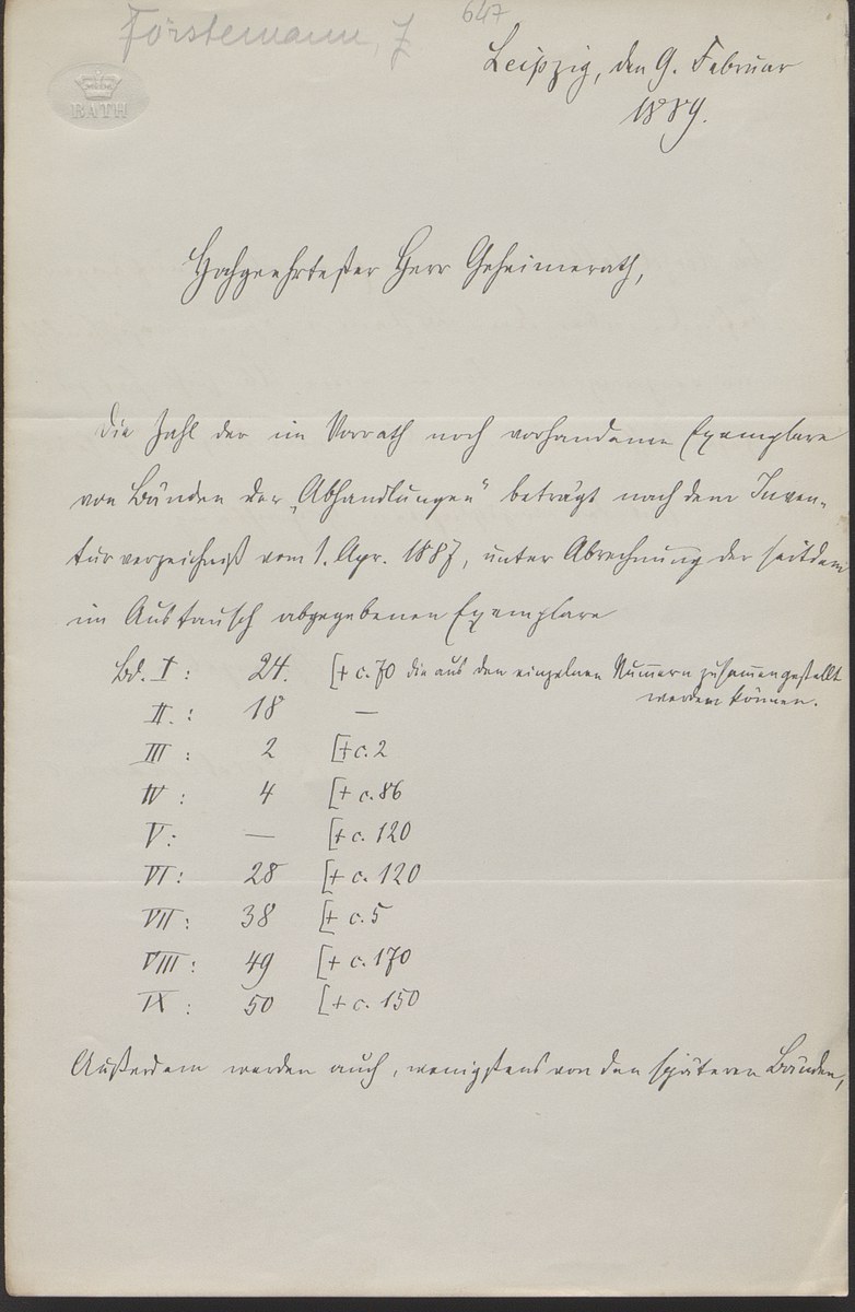 Universitätsbibliothek Leipzig, Nachlass Friedrich Zarncke, NL 249/1/F/647: Joseph Förstemann an Friedrich Zarncke (Leipzig, 1889-02-09)