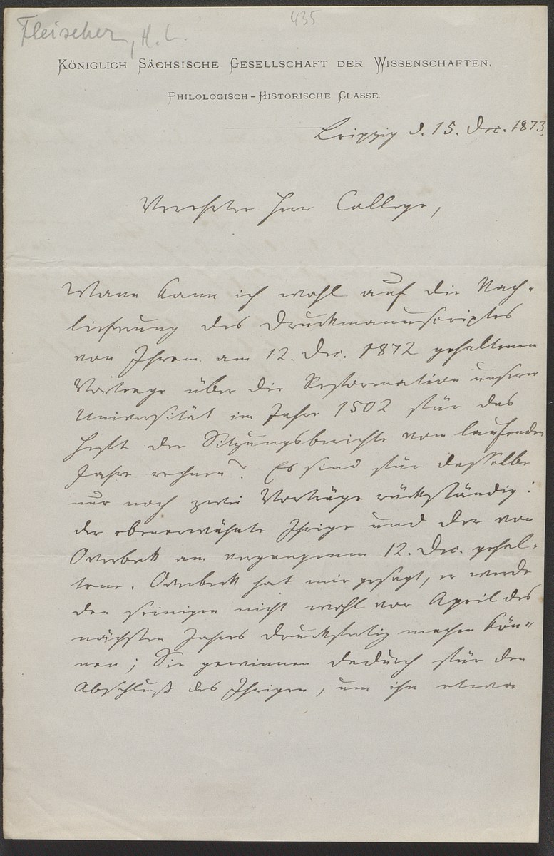 Universitätsbibliothek Leipzig, Nachlass Friedrich Zarncke, NL 249/1/F/435: Heinrich Leberecht Fleischer an Friedrich Zarncke (Leipzig, 1873-12-15), S. 1 Bl. (2 S.)