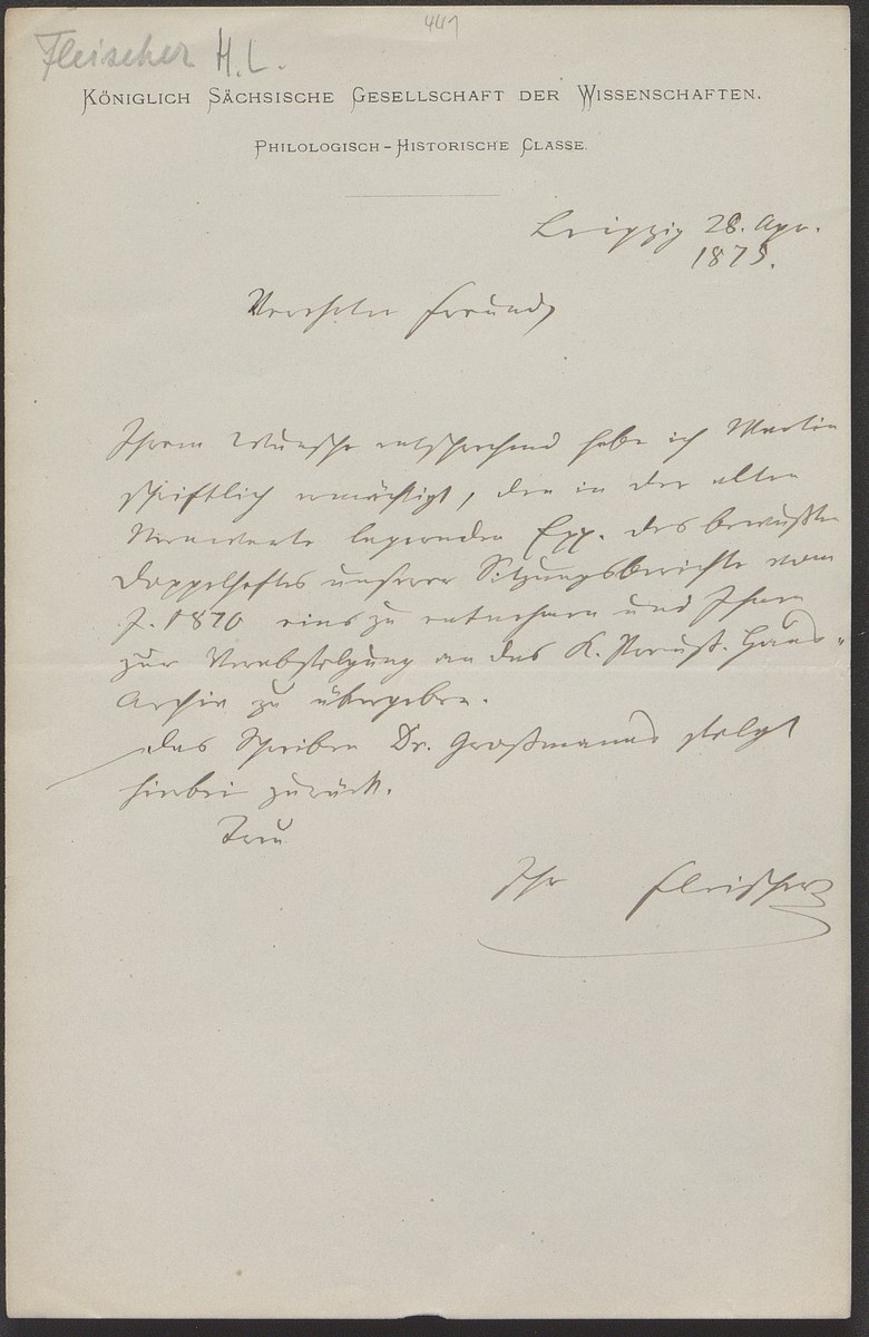 Universitätsbibliothek Leipzig, Nachlass Friedrich Zarncke, NL 249/1/F/441: Heinrich Leberecht Fleischer an Friedrich Zarncke (Leipzig, 1875-04-28), S. 1 Bl. (1 S.)
