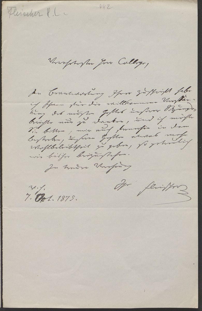 Universitätsbibliothek Leipzig, Nachlass Friedrich Zarncke, NL 249/1/F/442: Heinrich Leberecht Fleischer an Friedrich Zarncke (Leipzig, 1875-10-07), S. 1 Bl. (1 S.)