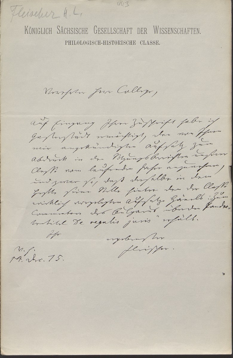 Universitätsbibliothek Leipzig, Nachlass Friedrich Zarncke, NL 249/1/F/443: Heinrich Leberecht Fleischer an Friedrich Zarncke (Leipzig, 1875-12-14), S. 1 Bl. (1 S.)