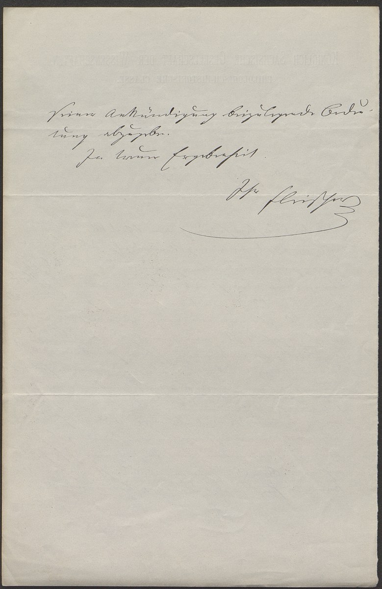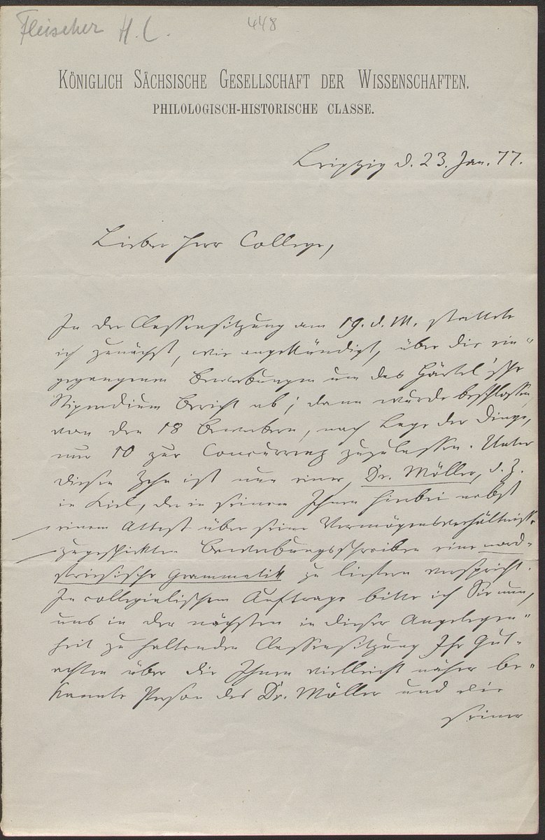 Universitätsbibliothek Leipzig, Nachlass Friedrich Zarncke, NL 249/1/F/448: Heinrich Leberecht Fleischer an Friedrich Zarncke (Leipzig, 1877-01-23), S. 1 Bl. (2 S.)