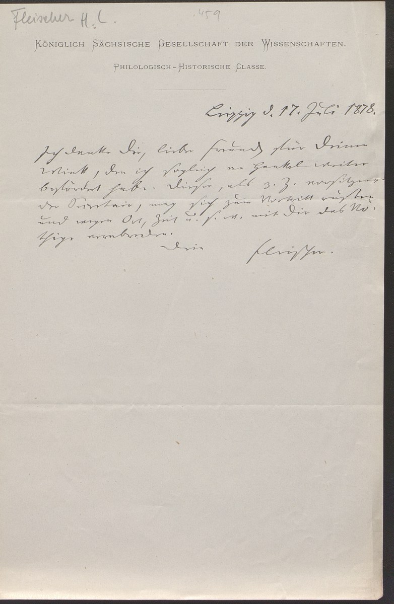 Universitätsbibliothek Leipzig, Nachlass Friedrich Zarncke, NL 249/1/F/459: Heinrich Leberecht Fleischer an Friedrich Zarncke (Leipzig, 1878-07-17), S. 1 Bl. (1 S.)