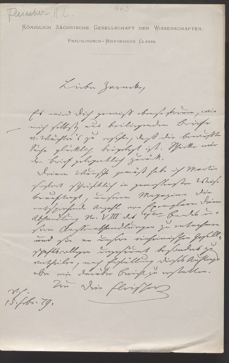 Universitätsbibliothek Leipzig, Nachlass Friedrich Zarncke, NL 249/1/F/463: Heinrich Leberecht Fleischer an Friedrich Zarncke (Leipzig, 1879-02-15), S. 1 Bl. (1 S.)