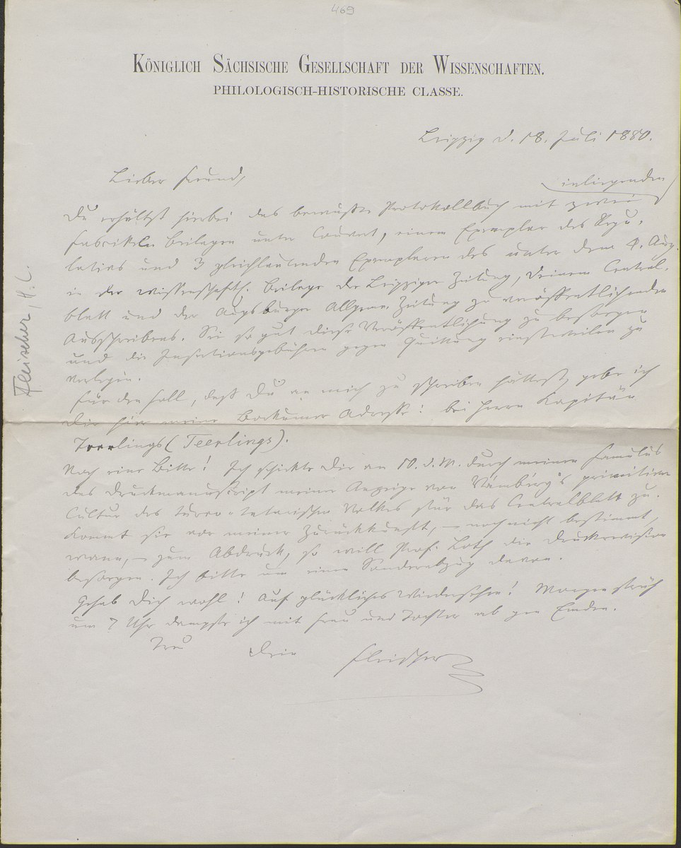Universitätsbibliothek Leipzig, Nachlass Friedrich Zarncke, NL 249/1/F/469: Heinrich Leberecht Fleischer an Friedrich Zarncke (Leipzig, 1880-07-18), S. 1 Bl. (1 S.)