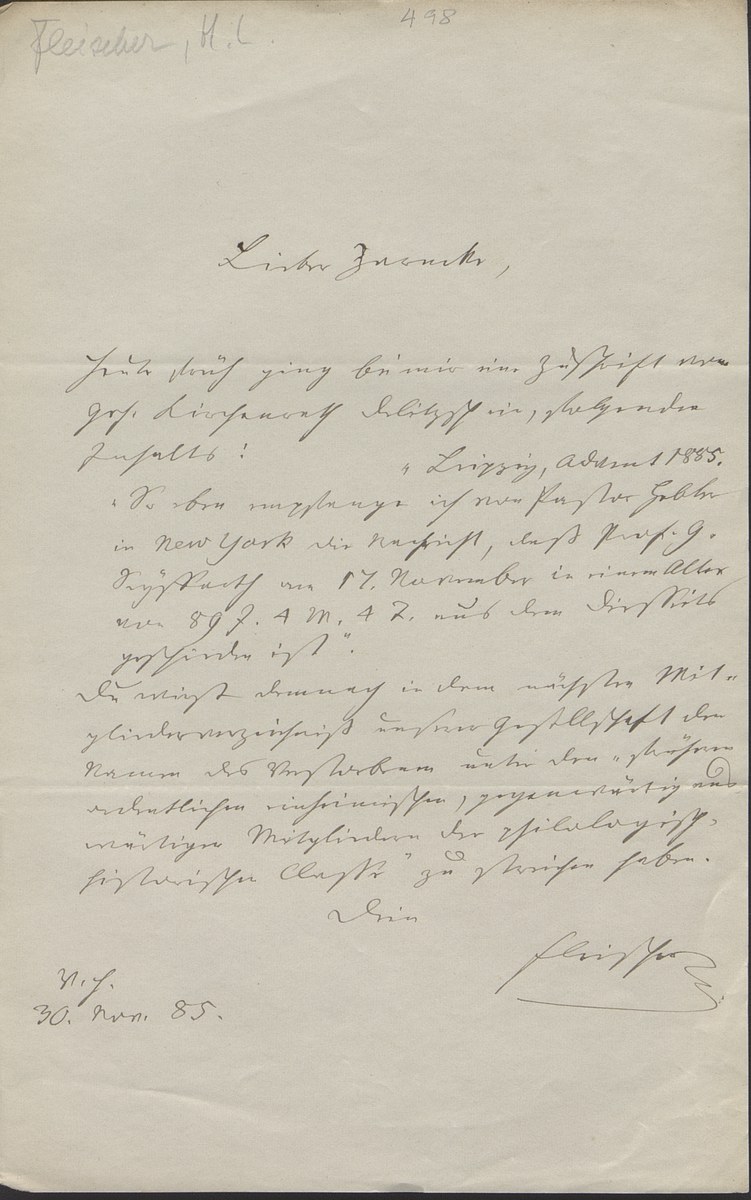 Universitätsbibliothek Leipzig, Nachlass Friedrich Zarncke, NL 249/1/F/498: Heinrich Leberecht Fleischer an Friedrich Zarncke (Leipzig, 1885-11-30), S. 1 Bl. (1 S.)
