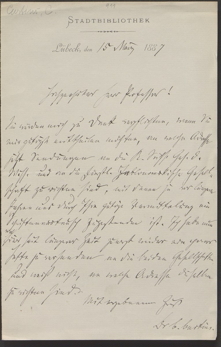 Universitätsbibliothek Leipzig, Nachlass Friedrich Zarncke, NL 249/1/C/911: Carl Curtius an Friedrich Zarncke (Lübeck, 1887-03-15), S. 1 Bl. (1 S.)