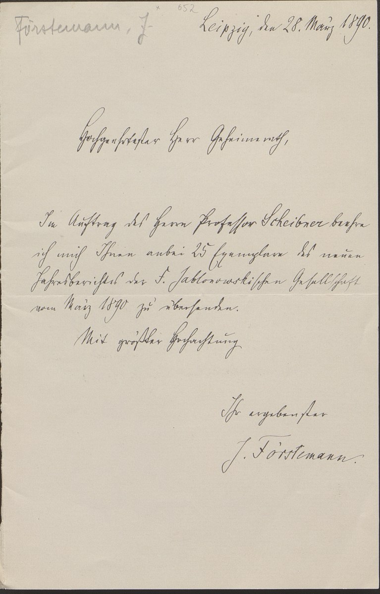 Universitätsbibliothek Leipzig, Nachlass Friedrich Zarncke, NL 249/1/F/652: Joseph Förstemann an Friedrich Zarncke (Leipzig, 1890-03-28), S. 1 Bl. (1 S.)