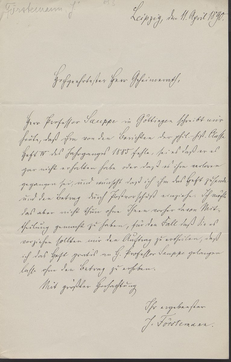 Universitätsbibliothek Leipzig, Nachlass Friedrich Zarncke, NL 249/1/F/653: Joseph Förstemann an Friedrich Zarncke (Leipzig, 1890-04-11), S. 1 Bl. (1 S.)