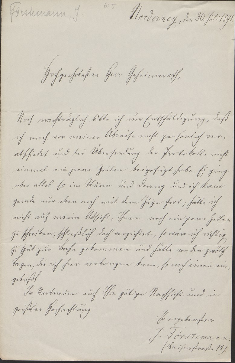 Universitätsbibliothek Leipzig, Nachlass Friedrich Zarncke, NL 249/1/F/655: Joseph Förstemann an Friedrich Zarncke (Norderney, 1891-07-30), S. 1 Bl. (1 S.)