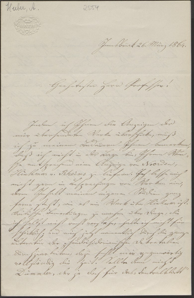 Alfons Huber an Friedrich Zarncke (Innsbruck, 1864-03-26)