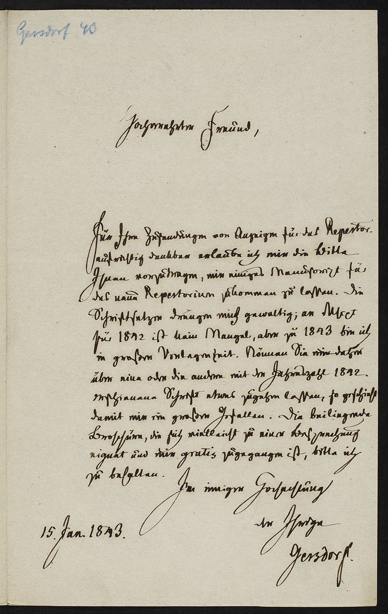 Ernst Gotthelf von Gersdorf an Heinrich Leberecht Fleischer (1843-01-15)
