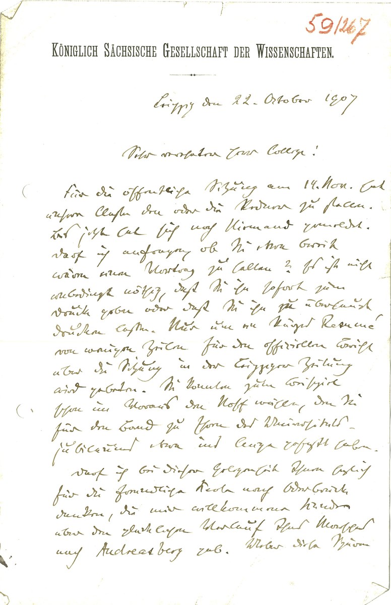 Anfrage bezüglich eines Vortrages für die Öffentliche Sitzung der Königl. Sächs. Gesellschaft der Wissenschaften am 14. November 1907.