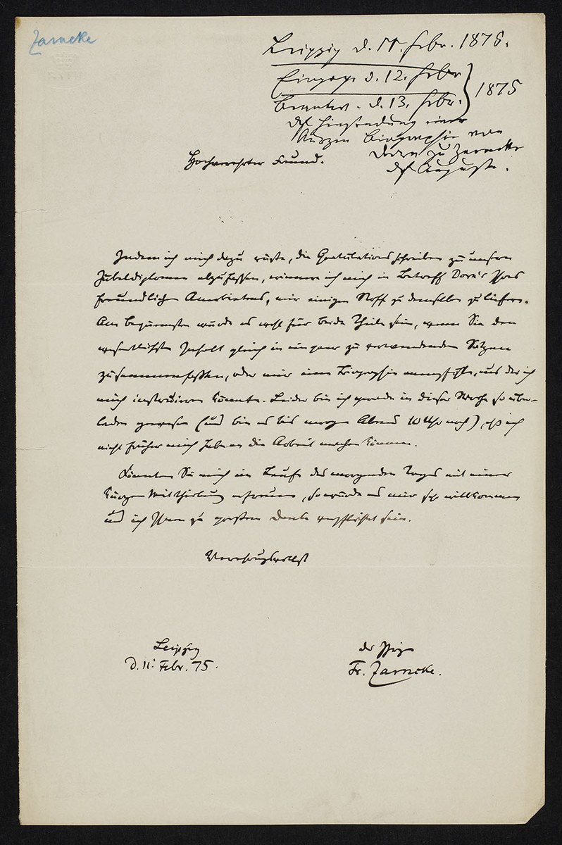 Friedrich Zarncke an Heinrich Leberecht Fleischer (Leipzig, 1875-02-11)