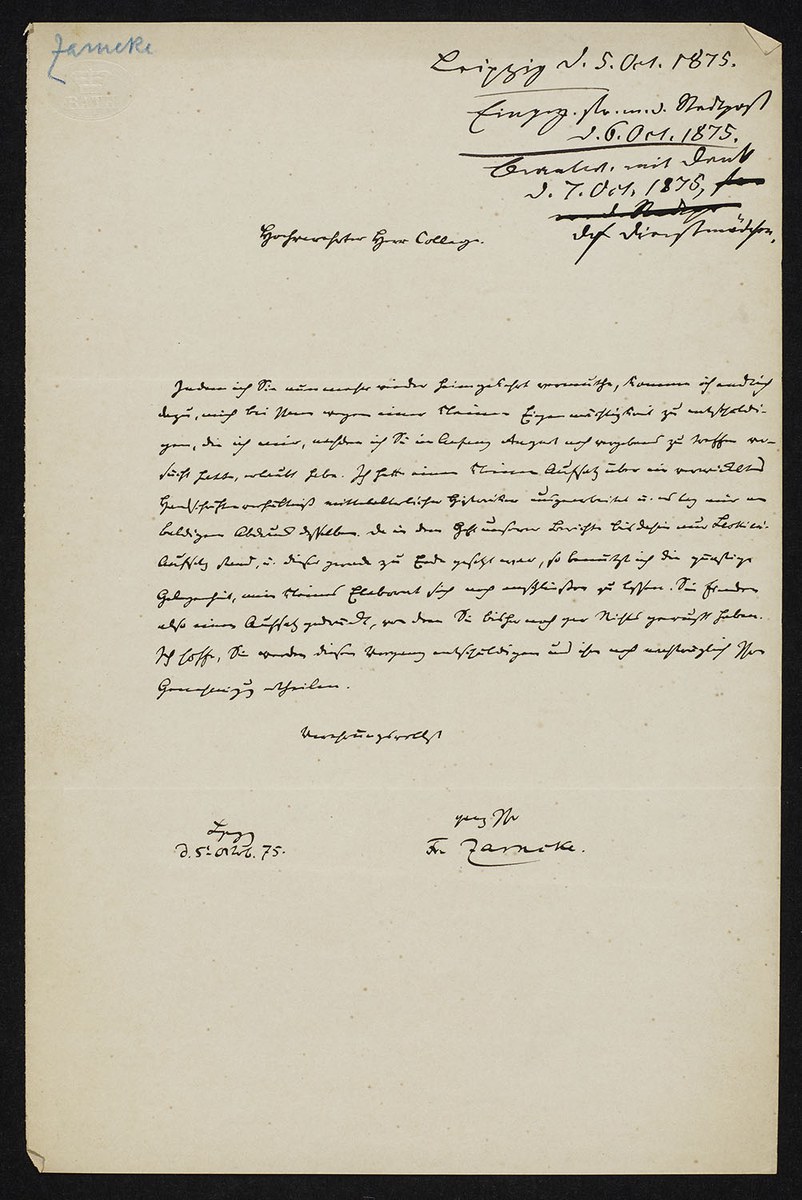 Det Kongelige Bibliotek, NKS 4°, 2969: Friedrich Zarncke an Heinrich Leberecht Fleischer (Leipzig, 1875-10-05), S. 1
