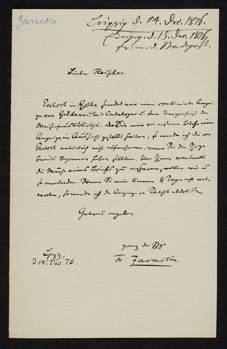 Friedrich Zarncke an Heinrich Leberecht Fleischer (Leipzig, 1876-12-14)