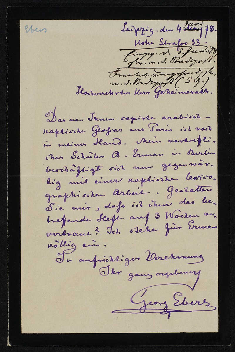 Det Kongelige Bibliotek, NKS 4°, 2969: Georg Moritz Ebers an Heinrich Leberecht Fleischer (Leipzig, 1878-06-04), S. 1