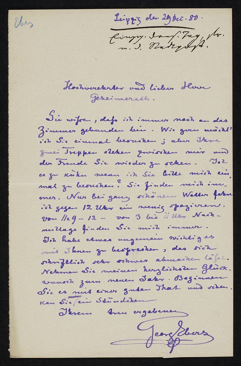 Det Kongelige Bibliotek, NKS 4°, 2969: Georg Moritz Ebers an Heinrich Leberecht Fleischer (Leipzig, 1880-12-29), S. 1