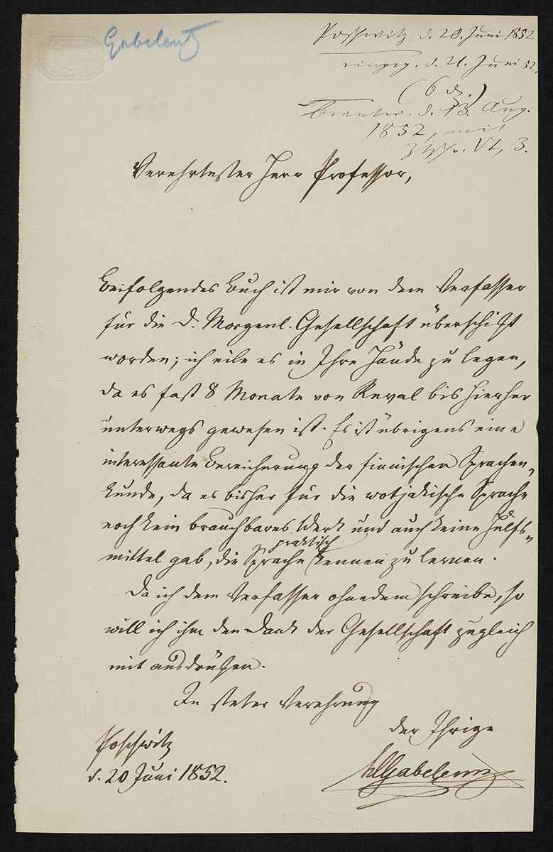 Hans Conon von der Gabelentz an Heinrich Leberecht Fleischer (Poschwitz, 1852-06-20)