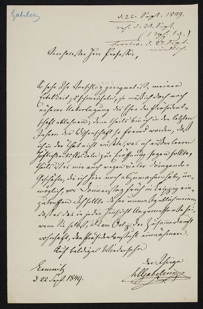 Hans Conon von der Gabelentz an Heinrich Leberecht Fleischer (Lemnitz, 1849-09-22)