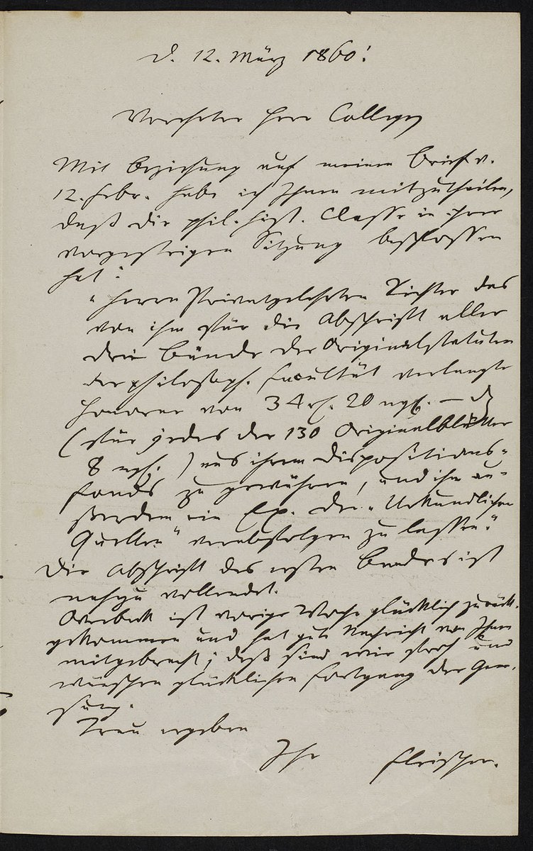 Det Kongelige Bibliotek, NKS 4°, 2969: Heinrich Leberecht Fleischer an Friedrich Zarncke (Leipzig, 1860-03-12), S. 1