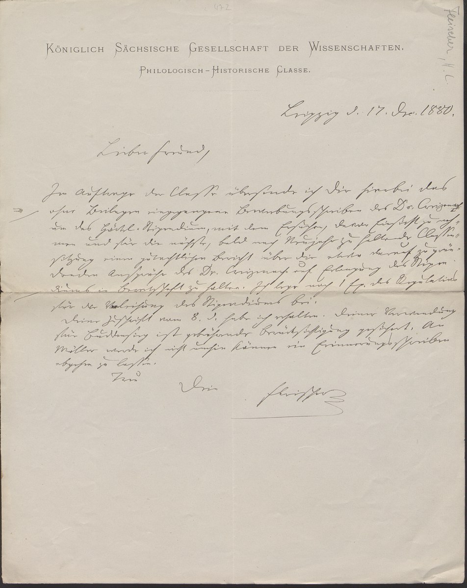 Universitätsbibliothek Leipzig, Nachlass Friedrich Zarncke, NL 249/1/F/472: Heinrich Leberecht Fleischer an Friedrich Zarncke (Leipzig, 1880-12-17)