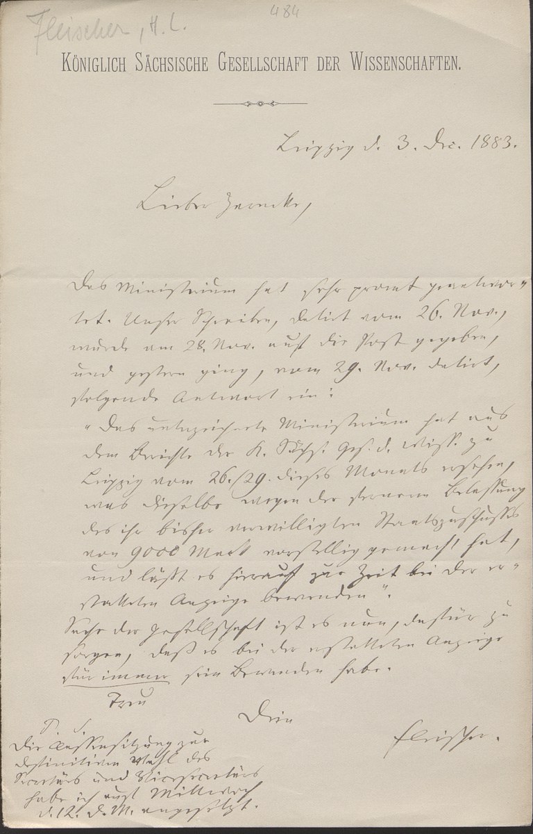 Universitätsbibliothek Leipzig, Nachlass Friedrich Zarncke, NL 249/1/F/484: Heinrich Leberecht Fleischer an Friedrich Zarncke (Leipzig, 1883-12-03)