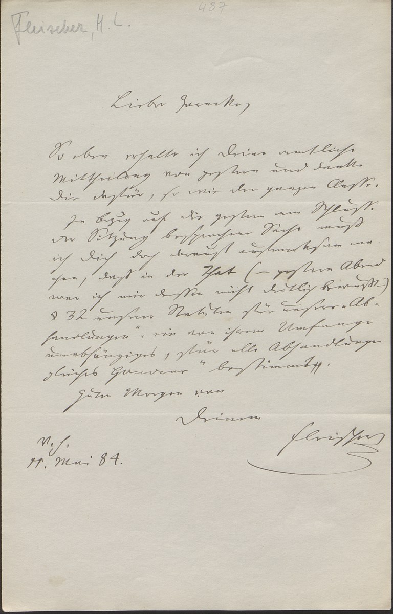Universitätsbibliothek Leipzig, Nachlass Friedrich Zarncke, NL 249/1/F/487: Heinrich Leberecht Fleischer an Friedrich Zarncke (Leipzig, 1884-05-11)