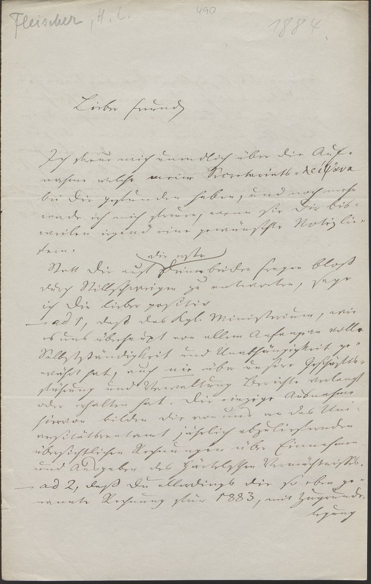 Universitätsbibliothek Leipzig, Nachlass Friedrich Zarncke, NL 249/1/F/490: Heinrich Leberecht Fleischer an Friedrich Zarncke (Leipzig, 1884) (1884)