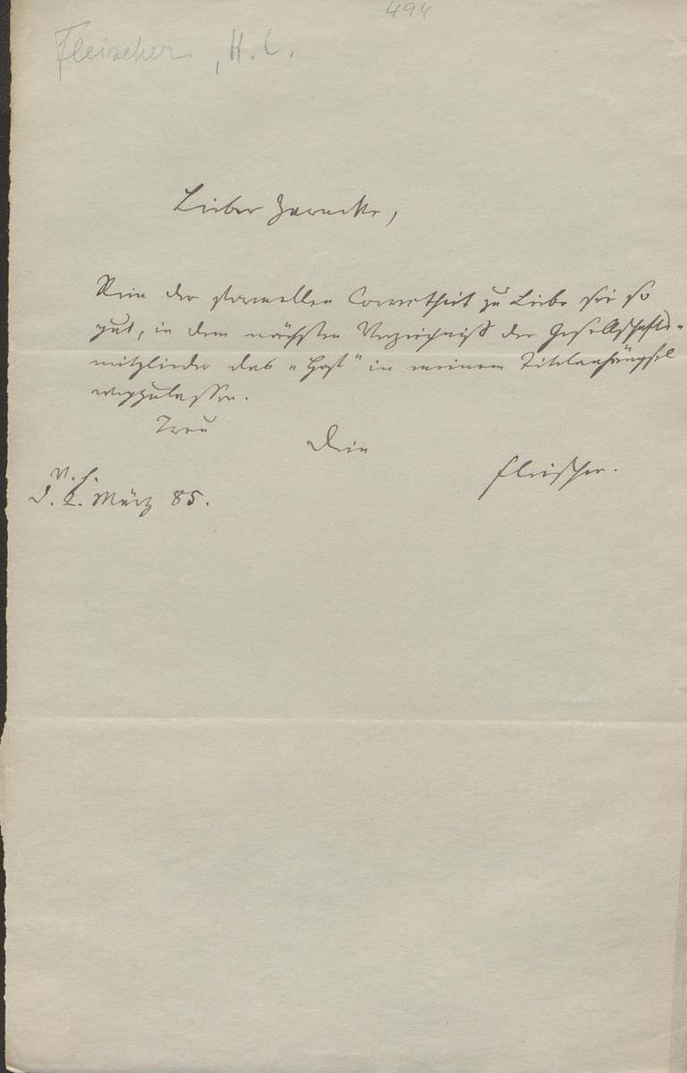 Universitätsbibliothek Leipzig, Nachlass Friedrich Zarncke, NL 249/1/F/494: Heinrich Leberecht Fleischer an Friedrich Zarncke (Leipzig, 1885-03-02) (1885)