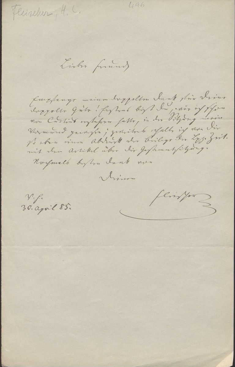 Universitätsbibliothek Leipzig, Nachlass Friedrich Zarncke, NL 249/1/F/496: Heinrich Leberecht Fleischer an Friedrich Zarncke (Leipzig, 1885-04-30) (1885)