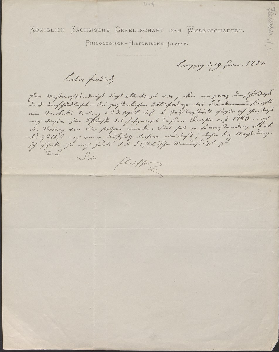 Universitätsbibliothek Leipzig, Nachlass Friedrich Zarncke, NL 249/1/F/474: Heinrich Leberecht Fleischer an Friedrich Zarncke (Leipzig, 1881-01-19)