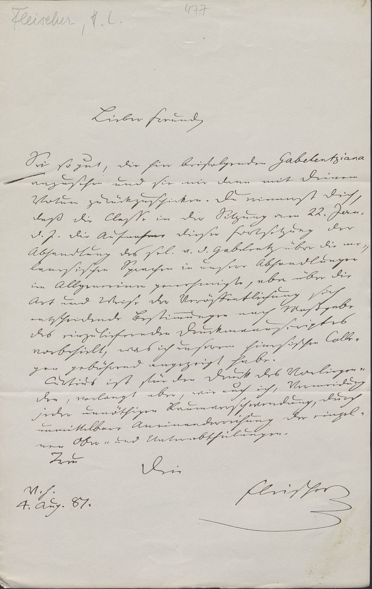 Universitätsbibliothek Leipzig, Nachlass Friedrich Zarncke, NL 249/1/F/477: Heinrich Leberecht Fleischer an Friedrich Zarncke (Leipzig, 1881-08-04)