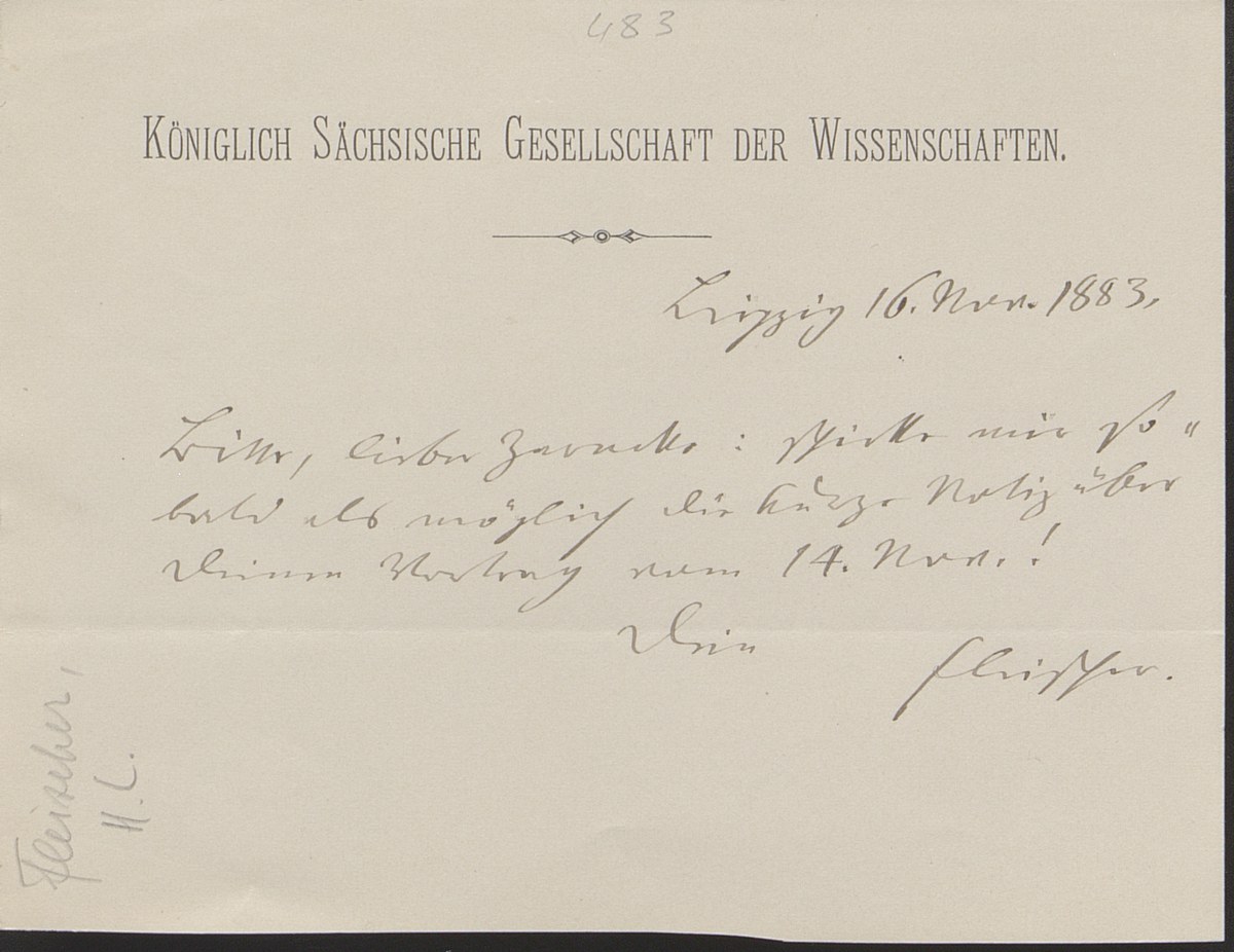 Universitätsbibliothek Leipzig, Nachlass Friedrich Zarncke, NL 249/1/F/483: Heinrich Leberecht Fleischer an Friedrich Zarncke (Leipzig, 1883-11-16)