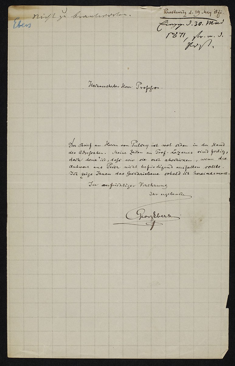 Det Kongelige Bibliotek, NKS 4°, 2969: Georg Moritz Ebers an Heinrich Leberecht Fleischer (Leipzig, 1871-05-29), S. 1