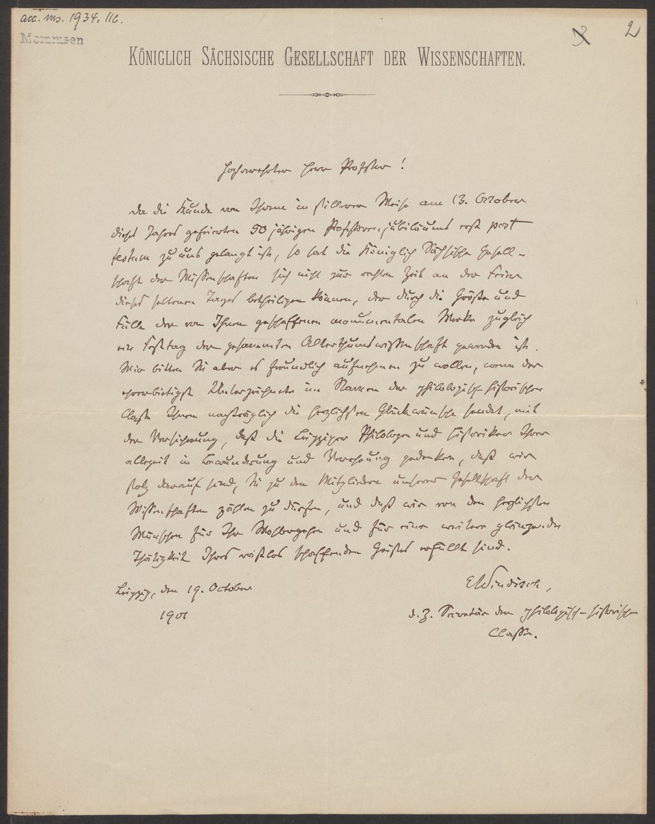 Staatsbibliothek zu Berlin, Nachlass Mommsen I, Windisch, Ernst; Blatt 2: Ernst Windisch an Theodor Mommsen (Leipzig, 1901-01-19)
