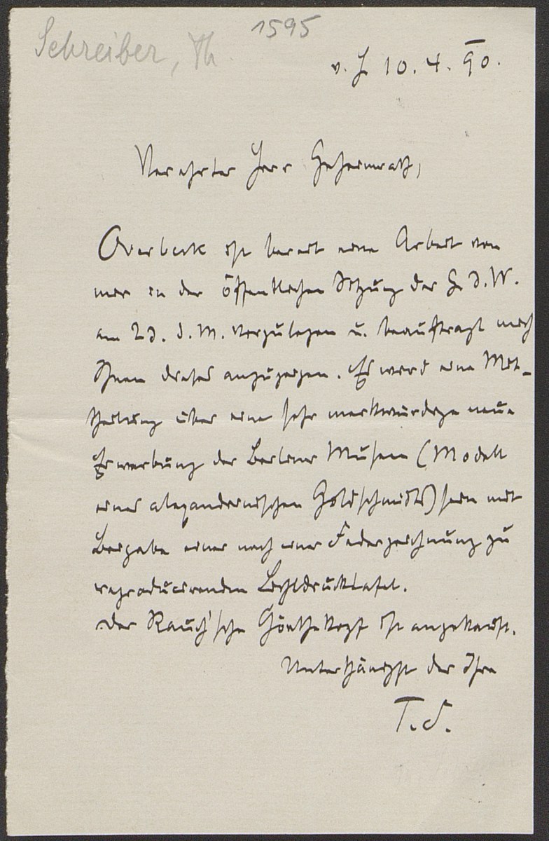 Universitätsbibliothek Leipzig, Nachlass Friedrich Zarncke, NL 249/1/S/1595: Theodor Schreiber an Friedrich Zarncke (Leipzig, 1890-04-10), S. nicht foliiert