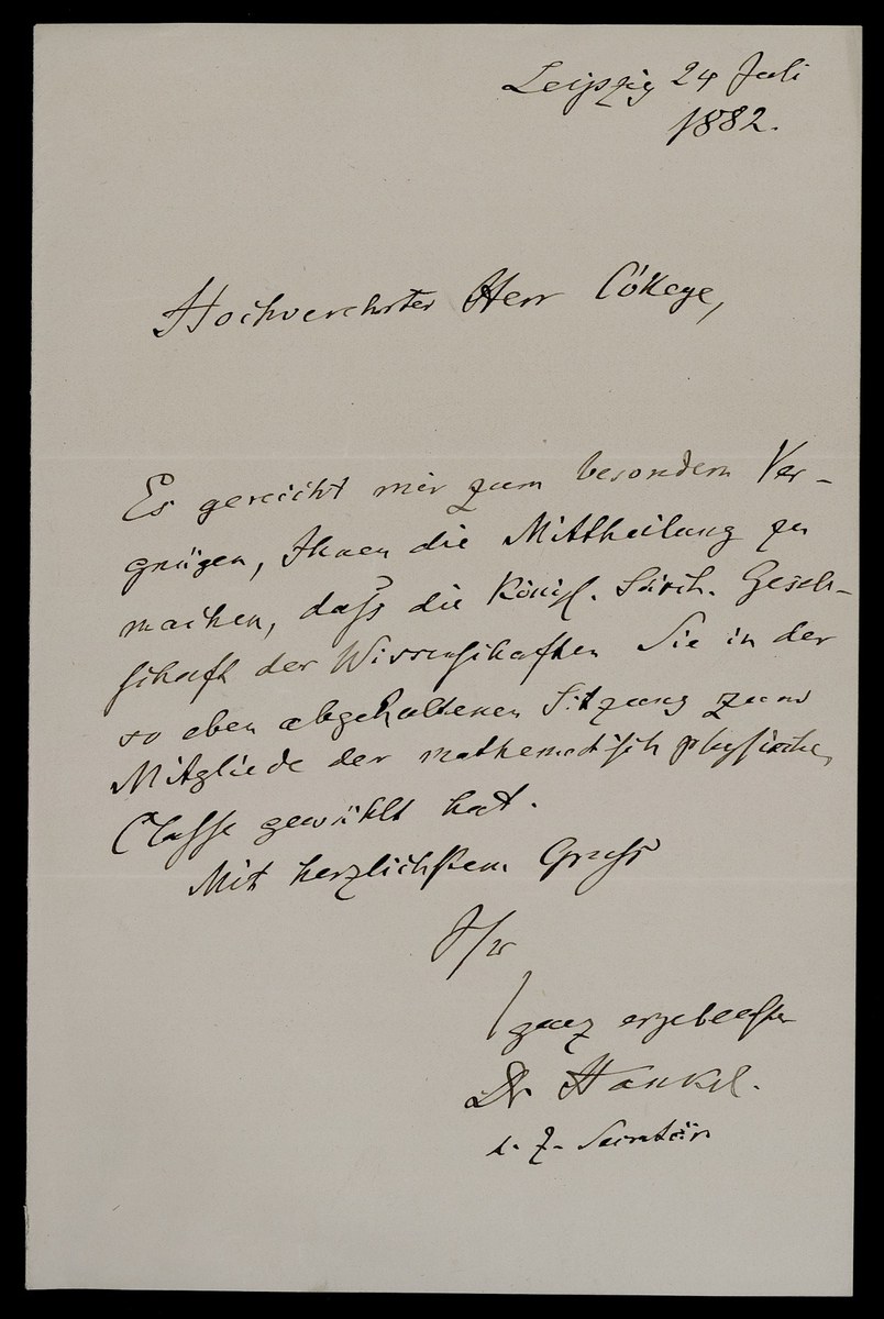 Zentralarchiv deutscher Mathematiker-Nachlässe, Nachlass Felix Klein, Cod Ms F Klein 114 Nr 8: Wilhelm Gottlieb Hankel an Felix Klein (Leipzig, 1882-07-24)
