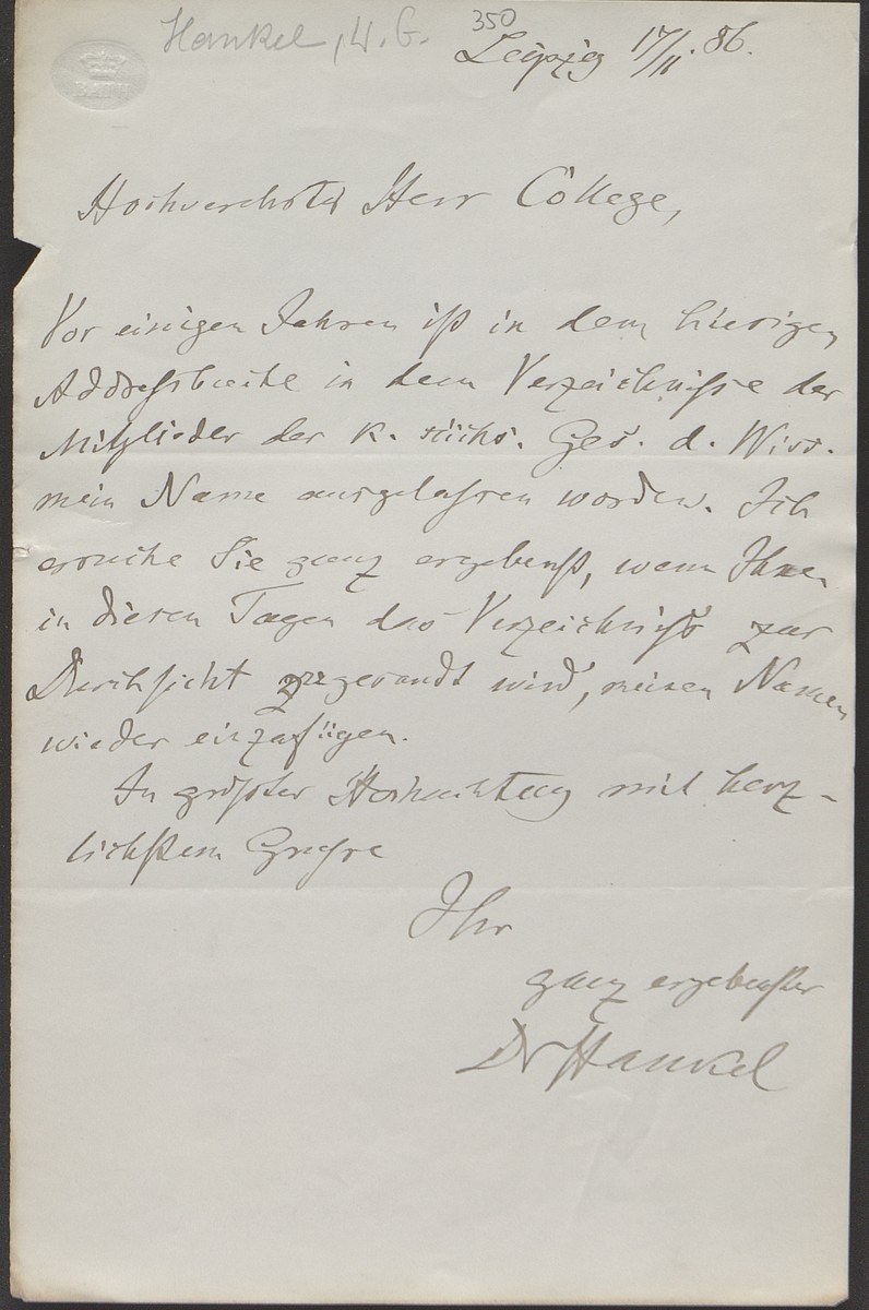 Universitätsbibliothek Leipzig, Nachlass Friedrich Zarncke, NL 249/1/H/350: Wilhelm Gottlieb Hankel an Friedrich Zarncke (Leipzig, 1886-12-17)