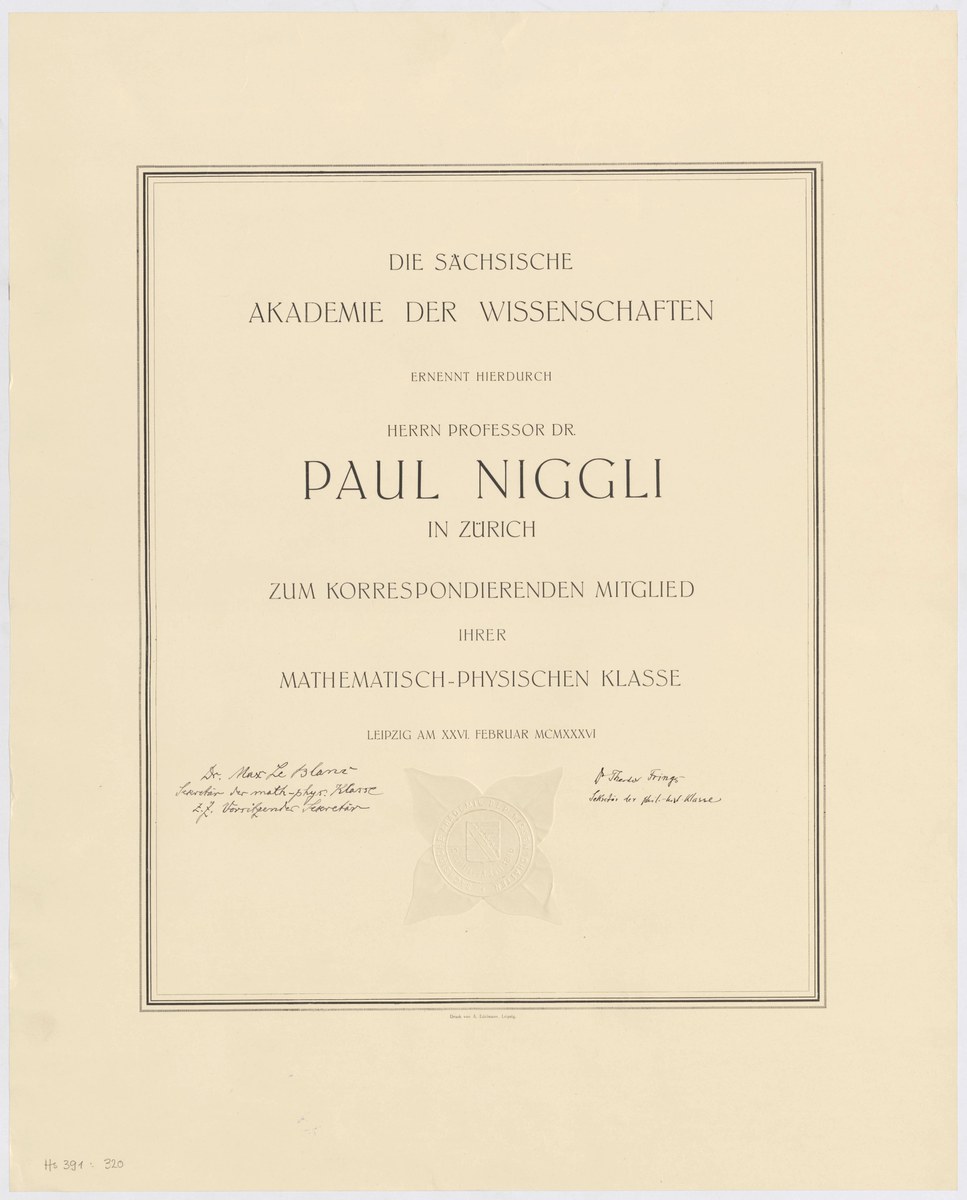 Ernennungsurkunde als korrespondierendes Mitglied der Sächsischen Akademie der Wissenschaften, unterschrieben (Paul Niggli)