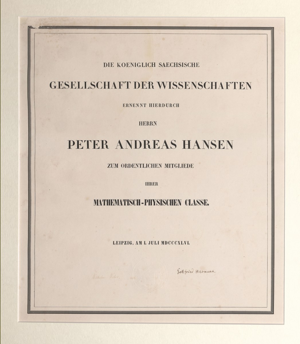 Ernennungsurkunde als ordentliches Mitglied der Königlich Sächsischen Gesellschaft der Wissenschaften (Peter Andreas Hansen)
