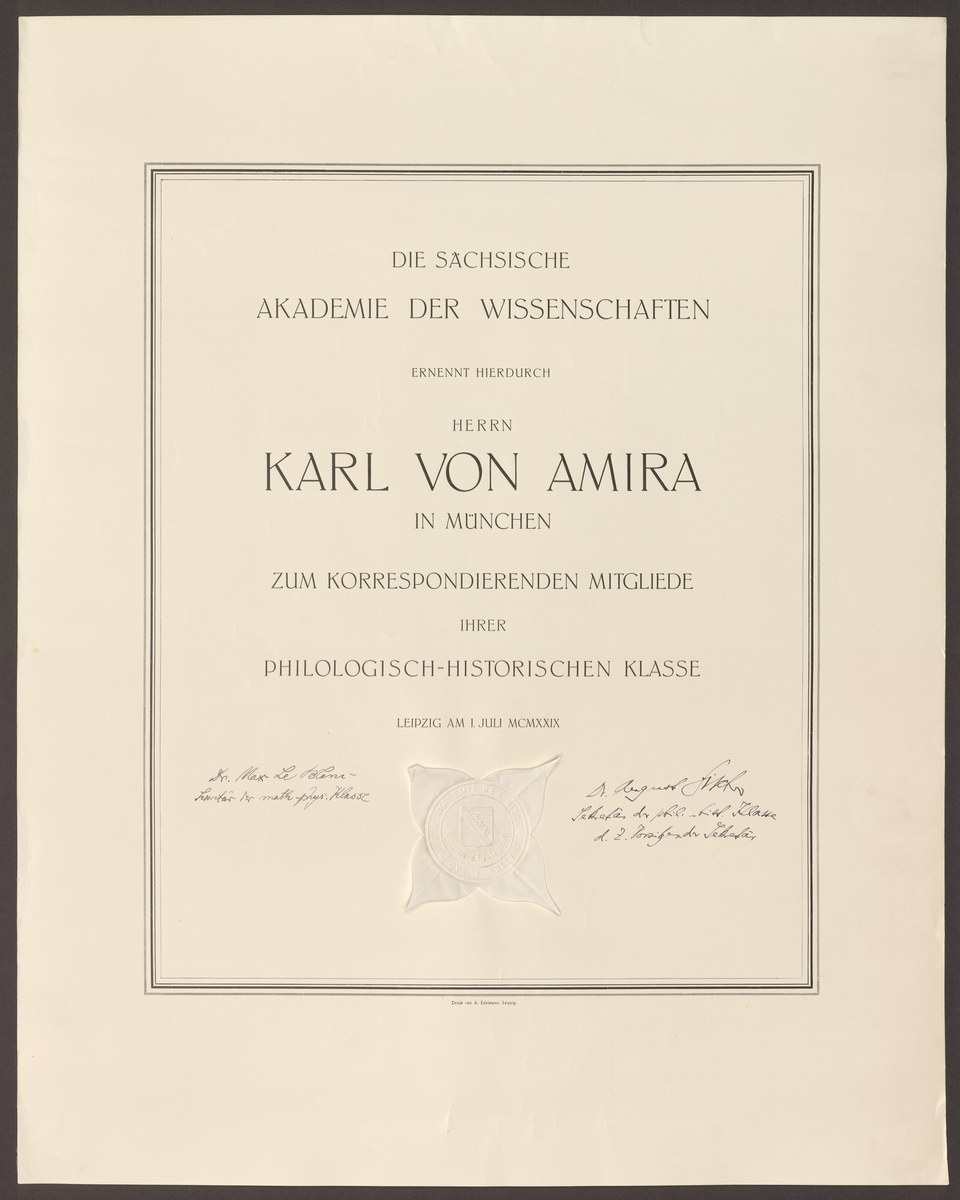 Bayerische Staatsbibliothek, Nachlass Karl von Amira, Amiraiana VIII.14 Urkunde: Ernennungsurkunde als korrespondierendes Mitglied der Sächsischen Akademie der Wissenschaften (Karl von Amira) (01.07.1929)