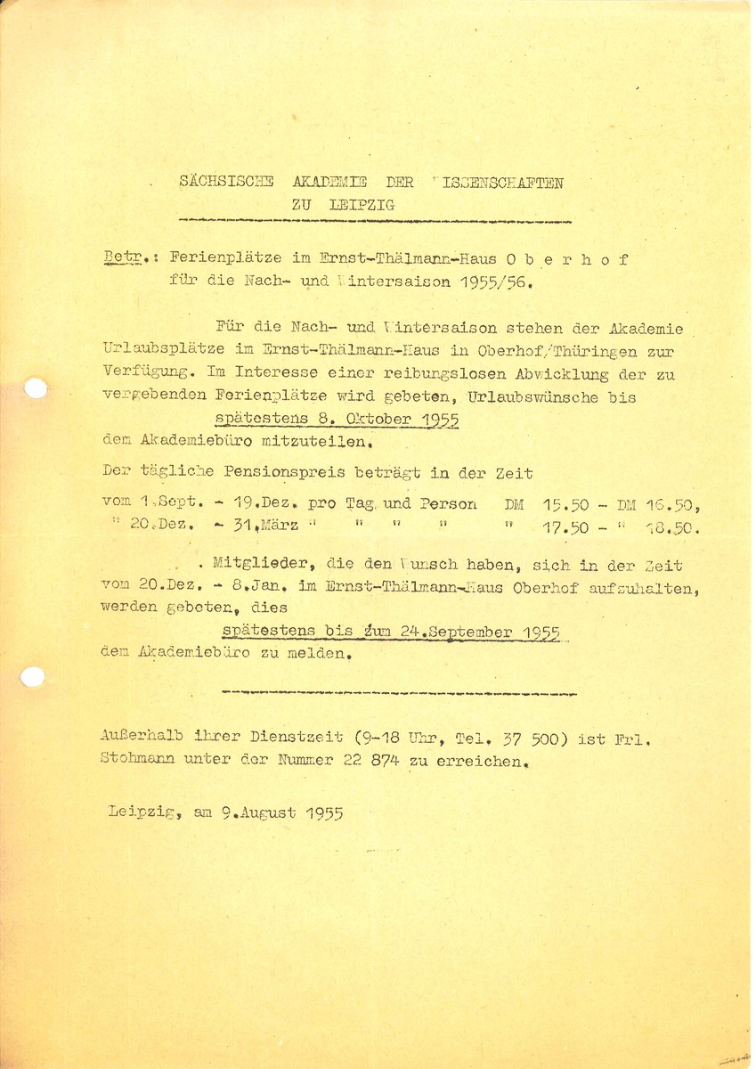 Universitätsarchiv der Technischen Universität Dresden, Nachlass Heinrich Barkhausen, Nr. 25: Ferienplätze im Ernst-Thälmann-Haus in Oberhof für die Sächsische Akademie der Wissenschaften (09.08.1955), S. 1